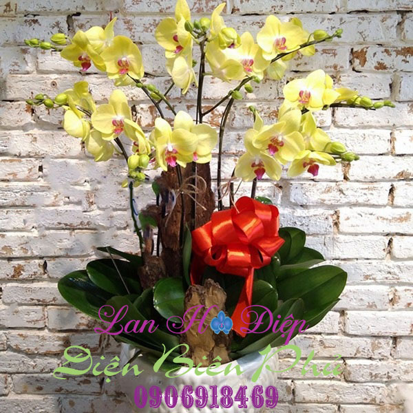 - Chậu Lan Hồ Điệp Vàng 7 Cành với 7 cành hoa màu vàng, lưỡi đỏ được ghép 2 tầng một cách khéo léo trong chậu sứ trắng tạo sự sang trọng ( trong hình là mẫu chậu sứ trắng, nét nổi bật là có các chấm đều quanh thân chậu. Ngoài ra, bạn có thể chọn các mẫu chậu trơn hay sọc...theo ý mình ). Màu sắc hoa tươi sáng, cánh hoa dày, to tròn, đối xứng với nhau tạo vẻ đẹp hài hòa. Màu vàng chính là màu đại diện cho sự may mắn, thích hợp cho khai trương, mang vượng khí đến cho gia chủ. Ngoài ra, chậu hoa được trang trí thêm vỏ thông bản lớn, tạo sự mộc mạc, gần gũi với thiên nhiên. Và một chiếc nơ đỏ lớn chính giữa chậu hoa, góp phần tăng may mắn đến gia chủ ( nếu chậu hoa được tặng vào dịp khai trương hay lễ tết, sinh nhật ). Bên cạnh đó, bạn cũng có thể chọn màu nơ hay các trang trí khác theo ý mình để tạo nên nét riêng.