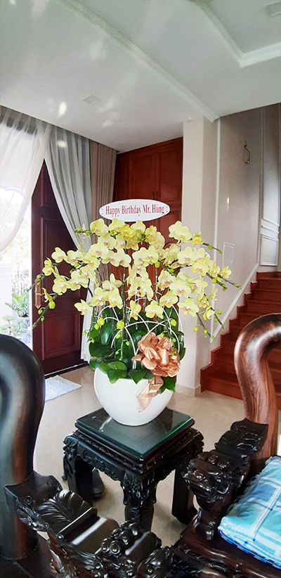 ( Chậu lan hồ điệp vàng đặt ở phòng khách tạo sự trang trọng )