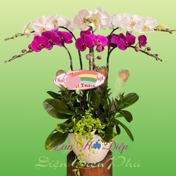 - Chậu Lan Hồ Điệp 6 Cành Tím Trắng được trang trí một cánh nhẹ nhàng mà thật đẹp mắt. Chậu lan được trang trí với chậu hạt dưa xanh tươi cắm rũ làm chậu hoa thêm điểm nhấn, kết hợp cùng những cành đuôi công và lá chanh cắm đan xen trông chậu thêm đầy đặn và sinh động hơn.
