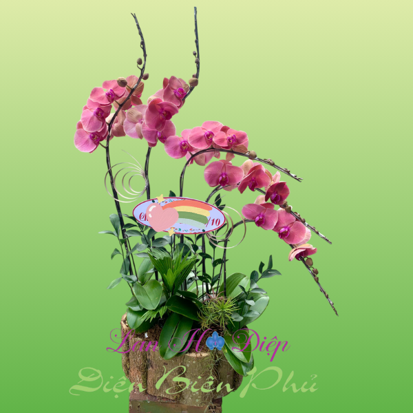 - Chậu lan hồ điệp 5 cành hồng sọc được ghép vào chậu gỗ kiểu oval, mẫu chậu mới về của cửa hàng chúng tôi. 5 cành lan được ghép hướng về 1 phía, các cành lan uốn cong làm chậu hoa thêm phần mềm mại. Chậu lan hồ điệp được trang trí với 1 cây dừa cảnh, cây không khí cắm rũ cùng lá chanh cắm đan xen làm chậu lan thêm sinh động và bắt mắt. Ngoài ra, trên cành lan còn được gắn 2 con sò tạo điểm nhấn khiến chậu lan thêm nổi bật hơn.