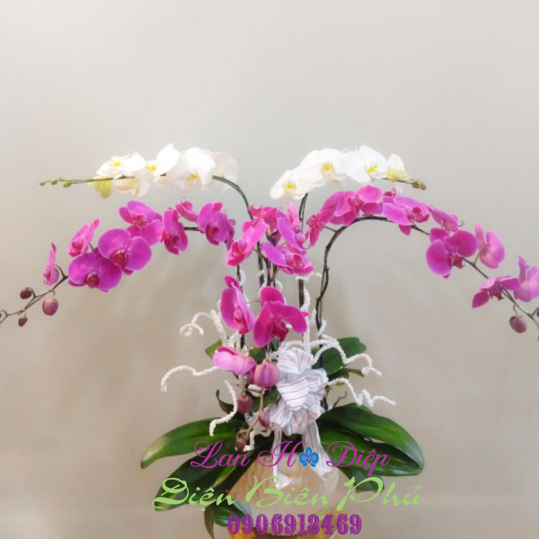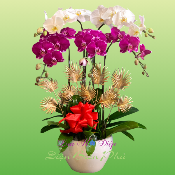 - Chậu Lan Hồ Điệp 5 Cành Trắng Tím Đột Biến là một chậu lan mang một vẻ đẹp độc đáo, khiến bao người thưởng hoa không thể nào cưỡng lại được trước 5 cành lan hồ điệp với 2 sắc màu tím và trắng. Người thợ cắm hoa thật tinh tế làm sao khi ghép 5 cành lan thành 2 tầng hoa đối xứng nhau: Tầng gồm 3 cành tím và tầng hai là 2 cành trắng. Những cành lan có kích thước lớn có đường kính từ 11-13cm, có độ dài khoảng 70 - 80 cm với mỗi cành nở rộ từ 6 - 10 bông/cành.