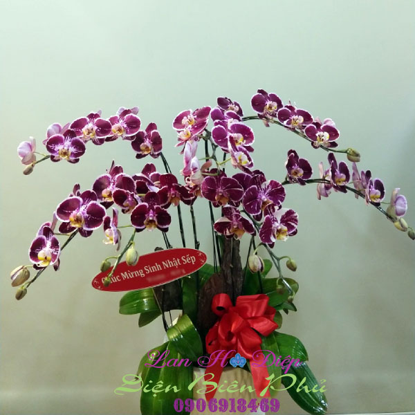 - Chậu Lan Hồ Điệp Đột Biến Tím 7 Cành gồm 7 cành lan hồ điệp đột biến tím được ghép khéo léo thành hai tầng hoa vào chậu men sứ trắng sang trọng và cao cấp. Tầng 1 gồm 3 cành, tầng 2 gồm 4 cành, với độ dài mỗi cành khoảng từ 70 đến 80 cm. Mỗi cành có khoảng từ 8 đến 10 bông đang nở rộ, đua nhau khoe sắc tựa như những con bướm đong đưa trong nắng mai, chào đón ngày mới. Cánh lan mang một vẻ đẹp vừa độc đáo vừa mới lạ bởi những viền trắng cùng chiếc lưỡi vàng tươi thắm càng tô điểm cho cành lan thêm hấp dẫn và đẹp mắt. Chậu lan được trang trí đơn giản bởi những bản gỗ thông to dày cùng chiếc nơ sự kiện đỏ tươi góp phân tôn lên vẻ đẹp sang trọng và quý phái của dòng lan.
