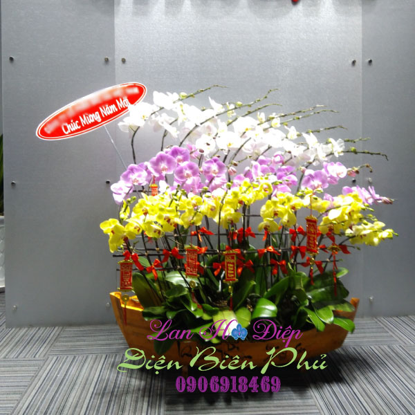 - Lan Hồ Điệp Tết Vàng Hồng Trắng 30 Cành gồm 30 cành lan rực rỡ được người thợ cắm hoa của công ty chúng tôi ghép khéo léo vào chậu gỗ hình chiếc thuyền độc đáo tôn lên dáng vẻ thanh tao, trang nhã của dòng lan. Các cành lan dài hướng lên cao ghép thành 3 tầng hoa trắng, hồng, vàng lộng lẫy, mỗi tầng gồm 10 cành tượng trưng cho sự may mắn của một năm mới bình an và phát tai phát lộc. Mỗi cành lan thường có từ 8 đến 12 bông, với các hoa đang đua nhau khoe sắc nở rộ thể hiện sức sống dồi dào. Hai cánh xoè rộng kín, môi hoa cong dẹp có hai râu dài nên cả đóa hoa trông giống như con bướm xinh xắn đang đong đưa trong nắng mai chào đón ngày mới. Chính vì vậy, chậu Lan Hồ Điệp Vàng Hồng Trắng thường được xem là sự chọn lựa lý tưởng và hoàn hảo nhất trong nhiều dịp quan trọng, đặc biệt nhất có thể kể đến lễ tết, năm mới,...