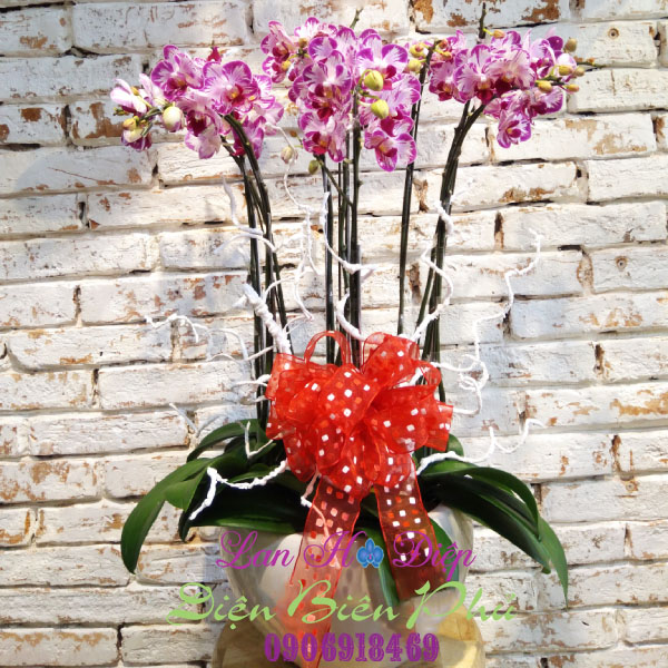 - Chậu Lan Hồ Điệp Đột Biến Tím 8 Cành gồm 8 cành lan tím với những bông hoa to tròn, xinh xắn được ghép khéo léo với xu hướng tỏa tròn vào chậu men sứ trắng sang trọng. Những bông hoa nở rộ, cánh hoa nhỏ xinh dày, xếp đối xứng vào nhau thể hiện cho tình yêu hạnh phúc và trọn vẹn. Màu tím tươi mới mang lại sự bồng bềnh, huyền ảo,, nhẹ nhàng, bắt mắt, thu hút bao ánh mắt người ngắm nhìn, khiến bao người đem lòng yêu quý. Hơn nữa, một chiếc nơ đỏ tươi chấm bi nhẹ kết hợp những cành tuyết trắng tạo nên vẻ đẹp hài hòa, không hề kém phần tinh tế và sang trọng. Bởi vậy, một chậu lan hồ điệp sẽ là một món quà ngọt ngào bày tỏ thành ý không thể tuyệt vời hơn để dành tặng cho người nhận trong những dịp lễ tết, sinh nhật.