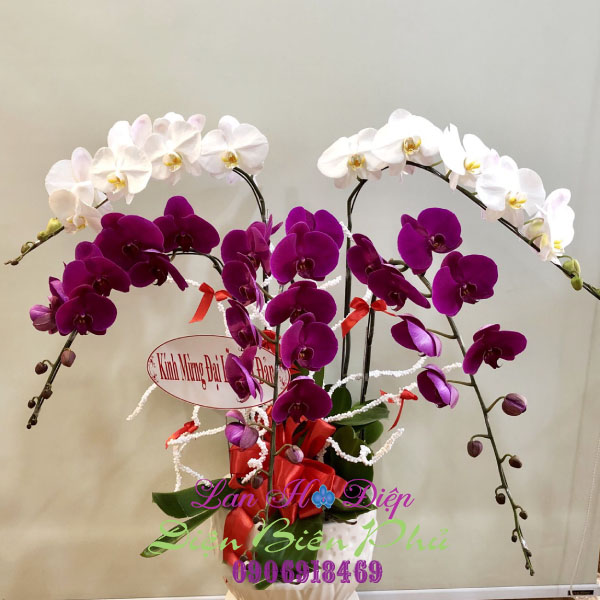- Chậu Lan Hồ Điệp 5 Cành Tím Trắng gồm 5 cành lan lớn 3 tím và 2 trắng được ghép chung vào chậu men sứ trắng, sắc trắng tinh khôi hòa mình cùng sắc tím mộng mơ trông thật độc đáo và hài hòa quyến rũ. Bởi vậy, một chậu lan hồ điệp sẽ là một món quà ngọt ngào bày tỏ thành ý không thể tuyệt vời hơn để dành tặng cho người nhận.