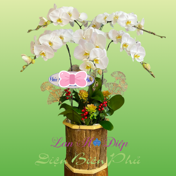 - Chậu Lan Hồ Điệp 5 Cành Trắng gồm 5 cành lan với sắc trắng tinh khôi được ghép khéo léo thành 2 tầng tuyệt đẹp, với tầng một gồm 3 cành và tầng hai là 2 cành, vào chiếc chậu gỗ sang trọng có bố cục cân đối tạo nên vẻ đẹp hài hòa. Các cành lan được khéo léo ghép với nhau tạo hình bắt mắt, hấp dẫn và lộng lẫy làm sao! Những cành lan xếp đối xứng, đều đặn với các bông to dày có đường kính từ 12-13cm, tròn trịa đã nở rộ từ 8-10 bông/ cành và nụ chớm nở đang đua nhau khoe sắc.