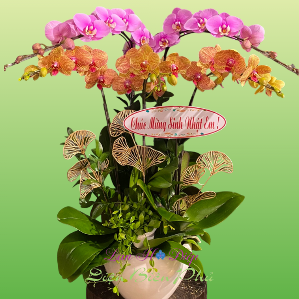 - Chậu Lan Hồ Điệp 5 Cành Hồng Cam gồm 5 cành hoa tươi thắm có hoa nở đều từ5-7bông/ cành (chưa tính nụ, tùy mùa mà hoa có độ nở nhiều hay ít), được ghép vào chậu men sứ cao cấp thể hiện được sự sang trọng, tôn lên vẻ đẹp của loài hoa cao sang quý phái. Người thợ cắm hoa đã tinh tế tạo hình với 5 cành lan hồng vàng thành 2 tầng; Tầng 1 gồm 3 cànhcam rực rỡ tầng hai gồm 2 cành hồng dịu dàng thể hiện được tấm lòng chân thành của người gửi đến người nhận về một lời chúc về sự may mắn, hạnh phúc và mọi điều tốt đẹp trong cuộc sống.