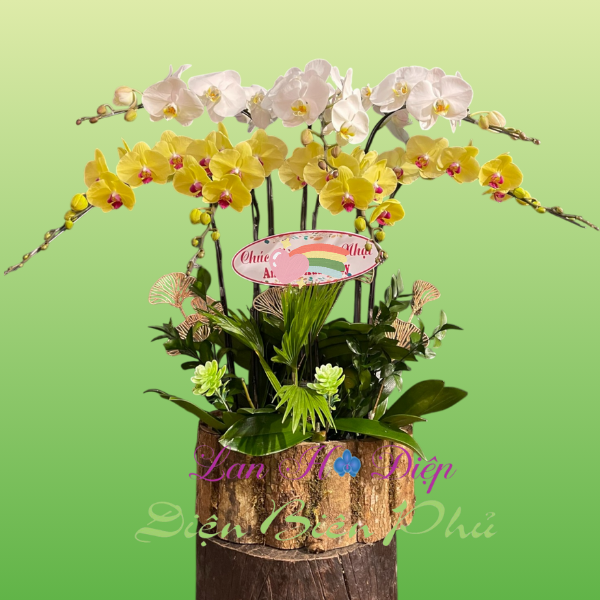 - Chậu Lan Hồ Điệp 7 Cành Vàng Trắng với lối trang trí đơn giản mà tinh tế, lá vàng rực rỡ xen kẽ những cành lá chanh xanh tươi, 1 cây cọ xanh mướt cùng 2 cành sen đá xinh xắn đã làm chậu lan thêm sinh động và đầy đặn. Bảy cành lan được ghép vào chậu hộp gỗ làm tăng sự mộc mạc cho chậu lan.
