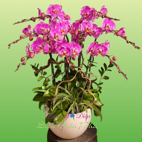 - Chậu Lan Hồ Điệp 9 Cành Tím Đột Biến được ghép trong chậu men sứ trắng cao cấp đẹp mắt, lối trang trí đầy tinh tế, 1 cây lan chi xanh tươi được gắn ở trung tâm, 2 đường dây rắn quấn quanh và những cành lá chanh cắm đan xen, khiến chúng trở nên độc đáo ai cũng phải ngước nhìn.
