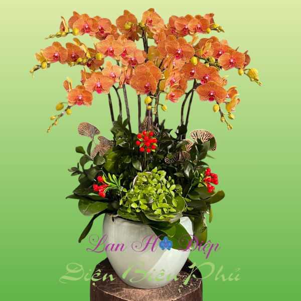 - Chậu Lan Hồ Điệp 10 Cành Cam gồm 10 cành lan cam được ghép một cách độc đáo mới lạ trong chậu sứ cao cấp góp phần tăng lên sự sang trọng của dòng lan. Được lựa chọn tỉ mỉ với độ hoa nở vừa từ 5-7 bông/cành (chưa tính nụ, tùy mùa mà hoa có độ nở nhiều hay ít), mỗi cành lan có kích thước tầm trung chỉ dài khoảng 30-50cm, nhưng không kém phần sang trọng, quý phái. Với 10 cành lan tạo thành ba tầng hoa: Tầng một gồm 3 cành, tầng 2 gồm 4 cành và tầng 3 gồm 3 cành đẹp mắt thể hiện tình cảm to lớn và chân thành dành cho người nhận. Sắc tím của lưỡi hoa tô điểm cho những cành lan cam làm rung động trái tim những người thưởng hoa.