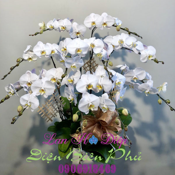 - Chậu Lan Hồ Điệp 11 Cành Trắng gồm 11 cành với độ hoa nở rộ từ 6-8 bông/ cành, các cành lan trắng có kích thước lớn chiều dài mỗi cành từ 60-70cm, những cánh bông mịn màng, tròn trịa nở lớn, hoa có đường kính từ 11-13cm, được người thợ cắm hoa ghép khéo léo thành 3 tầng hoa với xu hướng tỏa ra xung quanh thể hiện tình cảm bao la, bát ngát mà người tặng muốn gửi gắm đến người nhận. Tầng 1 gồm 5 cành, tầng 2 là 4 cành và tầng 3 là 2 cành, những bông lan đang nở rộ, đua nhau khoe sắc rực rỡ như đang chào đón ngày mới.
