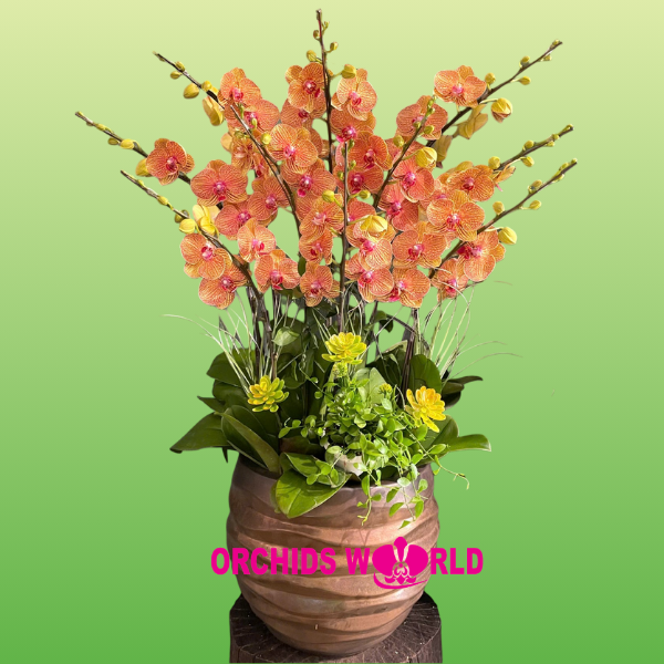 - Chậu Lan Hồ Điệp 10 Cành Cam Sọc với lối trang trí mộc mạc mà đầy tinh tế, một cây hạt dưa xanh tươi cắm rũ, những cành sen đá nhỏ cắm ở phía trước giúp chậu lan thêm xinh xắn, ngoài ra còn có những cành cỏ vươn lên trông chậu lan thêm đầy đặn và sinh động.