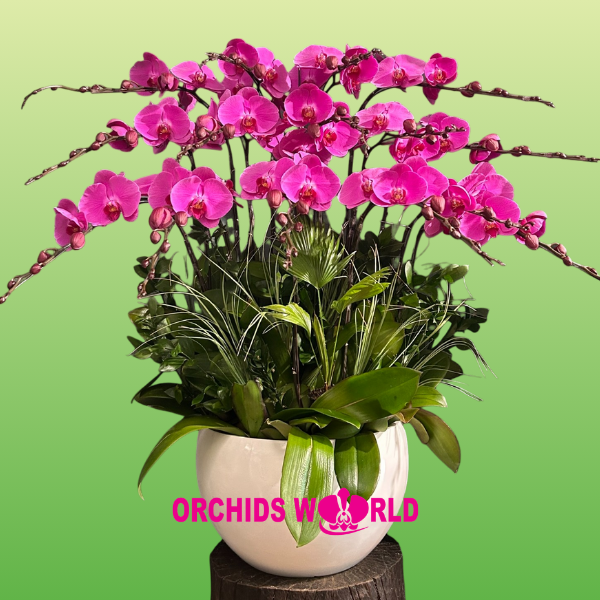 - Chậu Lan Hồ Điệp 15 Cành Tím gồm 15 cành lan hồ điệp tím được ghép khéo léo vào chậu men sứ trắng sang trọng tạo thành 3 tầng lan. Với số lượng cành lan hồ điệp tăng dần qua các cành: tầng 1 gồm 4 cành, tầng 2 gồm 5 cành và tầng 3 gồm 6 cành thể hiện một tình cảm thủy chung, sâu đậm, bền chặt và mãi tường tồn theo năm tháng của người gửi muốn truyền đạt đến người nhận về một tình yêu thiêng liêng, cao cả. Hơn nữa, màu tím còn là màu đại diện cho tình yêu gia đình hoặc tình cảm lứa đôi hay nỗi khát vọng sự bao dung, yêu thương giữa con người với nhau. Có lẽ vậy, mà những người yêu nhau mượn những cành hồ điệp tím trao tặng người yêu thương như một lời giải bày về tình yêu hay sự chờ mong về một tình yêu lãng mạn.... Cũng chính vì vậy, mà Lan Hồ Điệp Tím không những khẳng định được vị trí nhất định của mình trên thị trường mà còn trở thành một trong những sắc hoa được yêu thích nhất. Lối trang trí có phần bắt mắt, người thợ cắm hoa của công ty chúng tôi đã tinh tế trang trí những cây xanh tươi nào là lá cọ rồi những cành lá chanh xanh mướt được cắm xung quanh quanh chậu giúp chậu lan thêm hài hòa với thiên nhiên.