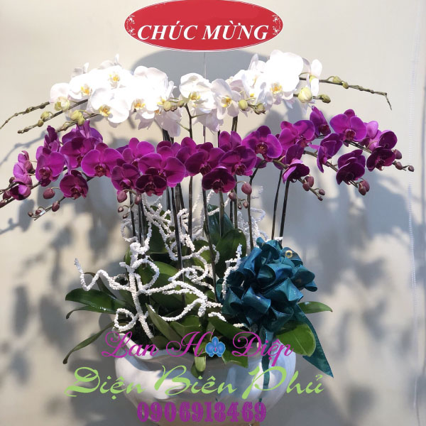 - Chậu Lan Hồ Điệp 15 Cành Tím Trắng là một sự kết hợp hài hòa giữa 7 cành lan trắng tầng 1 với 8 cành lan tím tầng 2 tạo nên một chậu lan vô cùng độc đáo. Màu trắng là màu của sự tinh khôi, ngây thơ và trong sáng kết hợp với màu tím lãng mạn và đằm thắm khiến bao người đem lòng yêu quý. Đây phải chăng là một biểu tượng về một tình yêu thiêng liêng chăng? Những cánh hoa to tròn, cân đối, xếp đối xứng vào nhau tựa như những con bướm đong đưa trong nắng mai chào đón ngày mới. Người ta thường bảo, số lượng hoa và nụ càng nhiều cả thể hiện sức sống mãnh liệt của gia chủ. Dưới bàn tay tài tình của người cắm hoa đã tạo nên một chậu lan vô cùng bắt mắt và sang trọng, thu hút người xem bởi vẻ đẹp quyến rũ khiến người khác khó lòng mà cưỡng lại được chỉ với vài vật trang trí đơn giản như cành tuyết trắng, nơ sự kiện.