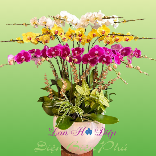 - Chậu Lan Hồ Điệp 15 Cành Trắng Vàng Tím là một sự kết hợp hoàn hảo của những dòng lan mang những vẻ đẹp riêng biệt được ghép khéo léo vào chậu men sứ sang trọng. Chỉ với 15 cành lan nhưng bao gồm rất nhiều sắc màu đẹp: nào là trắng, vàng, hay tím đột biến. Mỗi gam màu riêng tượng trưng một ý nghĩa riêng thể hiện được tấm lòng của người gửi đến người nhận trong dịp đặc biệt. Nhưng tất cả đều mang đến một vẻ đẹp về một tình yêu mãnh liệt và nồng cháy nhất phải không nào? Người thợ cắm hoa của công ty chúng tôi thật tài tình làm sao! Những cành lan hồ điệp này đã được chúng tôi chọn lựa một cách kỹ càng, là những cành lan đẹp nhất và chất lượng nhất của shop hoa chúng tôi. Với lối trang trí đơn giản, là sự kết hợp của những cành đồng tiền vàng, cây Hạt Dưa và Trầu Bà để chậu lan không còn đơn điệu mà trở nên hài hòa hơn. Sử dụng chậu men sứ trắng sang trọng càng tôn lên dáng vẻ sang trọng và quý phái của dòng lan.