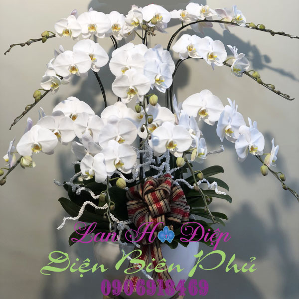 - Chậu Lan Hồ Điệp Trắng 10 Cành có lối trang trí đơn giản dưới bàn tay khéo léo của người thợ cắm hoa của công ty chúng tôi đã tạo ra một sản phẩm vô cùng tinh tế. Màu trắng là màu đại diện cho sự tao nhã, sang trọng kết hợp với màu vàng tươi mới, trẻ trung của lưỡi hoa càng tạo thêm sự duyên dáng cho cành lan thu hút ánh nhìn từ người thưởng hoa. Nơ sự kiện sọc caro nhẹ nhàng kết hợp cùng cành tuyết trắng muốt trong chậu men sứ sang trọng càng tôn lên vẻ đẹp kiêu sa của họ nhà lan. Mười cành lan trắng được ghép thành 3 tầng: tầng 1 gồm 3 cành, tầng 2 gồm 3 cành và tầng 3 gồm 4 cành với những bông lan đang nở rộ khoe sắc trong nắng mai như người thiếu nữ độ tuổi xuân thì với tấm lòng trinh nguyên, tình yêu trong sáng và thuần túy. Lưỡi vàng như một nét chấm phá cho cành lan thêm độc đáo.