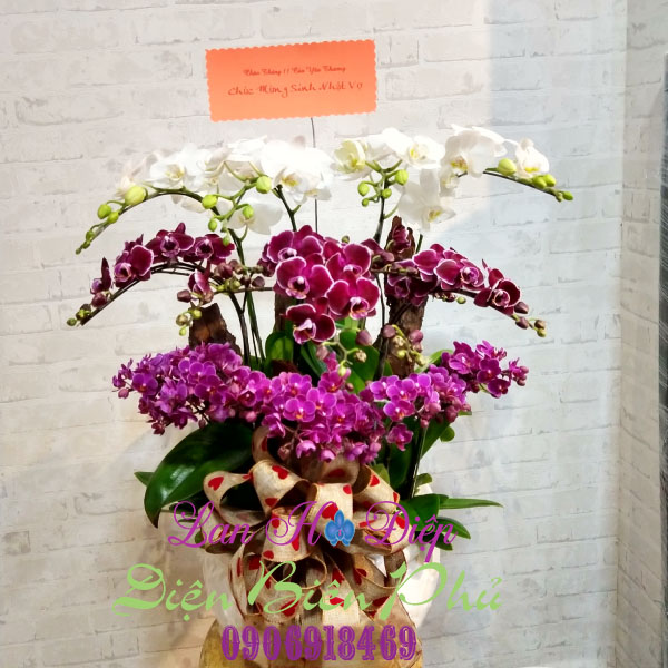 - Chậu Lan Hồ Điệp Đột Biến 12 Cành Tím Trắng Mini trông thật nhỏ nhắn, xinh xắn phải không nào chỉ với 12 cành lan hồ điệp đột biến với 3 gam màu khác nhau: trắng, tím và hồng. Người thợ cắm hoa thật tài tình làm sao khi ghép 12 cành hoa thành 3 tầng: tầng 1 gồm 4 cành lan trắng, tầng 2 gồm 3 cành lan tím mini và tầng 3 gồm 5 cành lan hồng mini. Những cánh lan mini nhỏ nhỏ, xinh xinh trông thật dễ thương làm sao khiến bao người thưởng hoa đem lòng yêu quý. Dòng lan hồ điệp mini mọc thành từng chùm, thể hiện sự trù phú và thịnh vượng cũng như tình cảm chân thành, tấm lòng bao la mà người tặng muốn gửi gắm đến người nhận. Phong cách trang trí đơn giản chỉ với những bản gỗ thông to dày, mộc mạc thể hiện sự gần gũi với thiên nhiên hữu tình cùng chiếc nơ sự kiện to càng tôn lên vẻ đẹp sang trọng và quý phái của chậu lan.