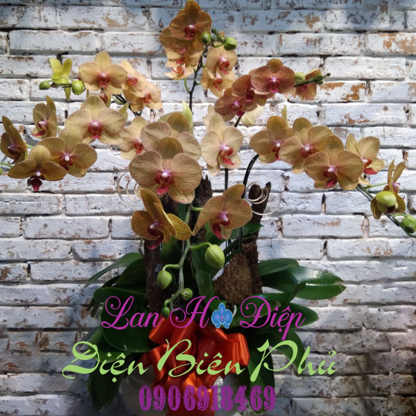 - Chậu Lan Hồ Điệp Cam 6 Cành Đột Biến gồm 6 cành lan cam sọc tươi thắm được ghép khéo léo vào nhau tạo thành 2 tầng hoa, mỗi tầng gồm 3 cành đẹp mắt thay nhau khoe sắc. Những cành hoa của Lan Hồ Điệp chủ yếu được mọc ra từ nách lá. Một cành lan có độ rộng khoảng 60 cm bao gồm nhiều đóa hoa và nở từ hoa này đến hoa khác, luân phiên với nhau. Những cành lan với các bông đã nở rộ và đính trên lưỡi hoa tựa như là những viên ngọc bắt mắt đang đua nhau khoe sắc trông giống những con bướm xinh xắn đong đưa trong nắng mai. Người ta thường bảo, số lượng hoa càng nhiều càng thể hiện sự sung túc của gia chủ cùng với sức sống mãnh liệt, sự trỗi dậy mạnh mẽ của thiên nhiên.