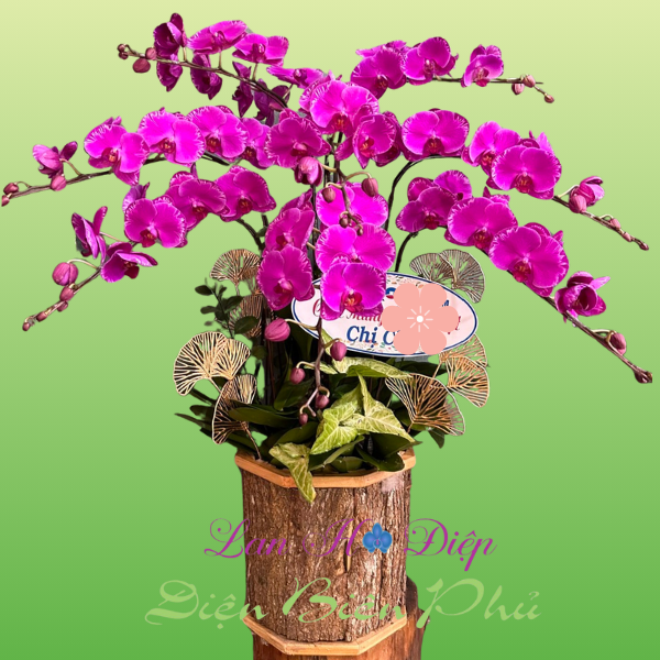- Chậu lan hồ điệp 8 cành tím được ghép vào chậu gỗ lạ mắt, được rất nhiều khách hàng ưa thích bởi đây là mẫu chậu mới về của cửa hàng chúng tôi. 8 cành lan được ghép thành 3 tầng, 2 tầng dưới là 3 cành lan và tầng trên cùng là 2 cành lan, tất cả đều hướng về một mặt. Những cành lan tím ngồng dài, mỗi cành với 11-13 hoa và nụ, khi nở rộ chắc chắn sẽ mang đến vẻ đẹp kiều diễm, đây sẽ là điểm sáng cho không gian của bạn. Khác với những cành lan với thuần sắc tím, những bông lan này đặc biệt ở chỗ là có những sọc trắng ở viền cánh hoa tạo điểm nhấn và sự mới lạ cho cành lan hồ điệp. Để chậu thêm phần thu hút, người thợ cắm hoa đã trang trí với những cành lá quạt vàng rực rỡ, 1 nhánh Trầu Bà xanh tươi mang ý nghĩa thịnh vượng và những cành lá chanh với sức sống bền lâu được cắm đan xen đã tạo nên một chậu lan đầy sinh động và tươi mới.