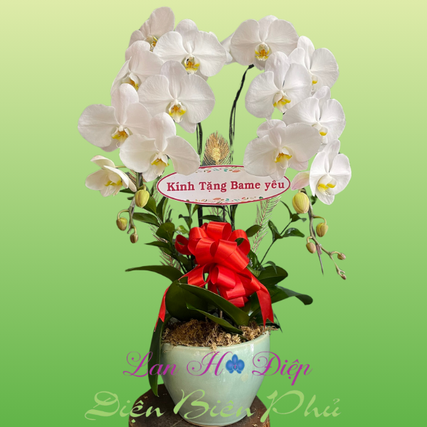 - Chậu Lan Hồ Điệp 2 Cành Trắng gồm 2 cành lan trắng tinh khôi được những người thợ cắm hoa khéo léo và tỉ mỉ vào chậu sứ màu xanh ngọc nhẹ nhàng và sang trọng. Lan Hồ Điệp trắnng được thể hiện cho sự trong sáng tinh khôi, nó là một màu sắc tinh khiết và ngây thơ, cũng mang lại ý nghĩa tích cực.