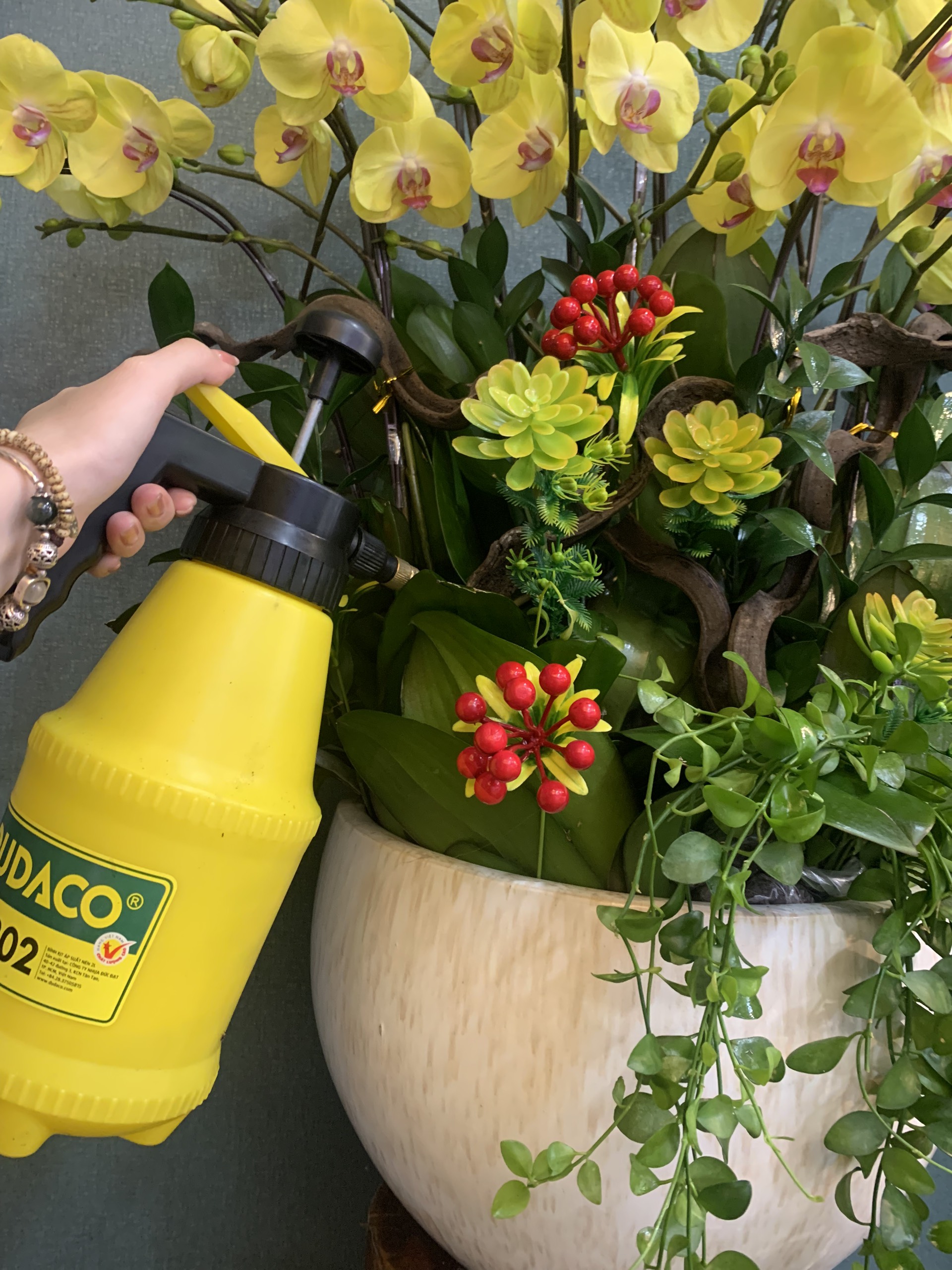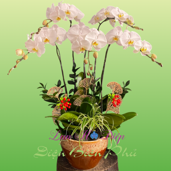 - Chậu Lan Hồ Điệp 5 Cành Trắng Lưỡi Vàng trên được trang trí một cách tinh tế với 2 cành trái đỏ rực rỡ làm điểm nhấn, bụi cỏ lan chi xanh tươi giúp chậu thêm đầy đặn. Ngoài ra chậu còn được trang trí với 3 cành lá quạt vàng mang ý nghĩa tài lộc được cắm đan xen với những cành lá chanh có sức sống bền lâu. Tất cả kết hợp lại với nhau tạo nên chậu lan hồ điệp rực rỡ, khoe sắc.