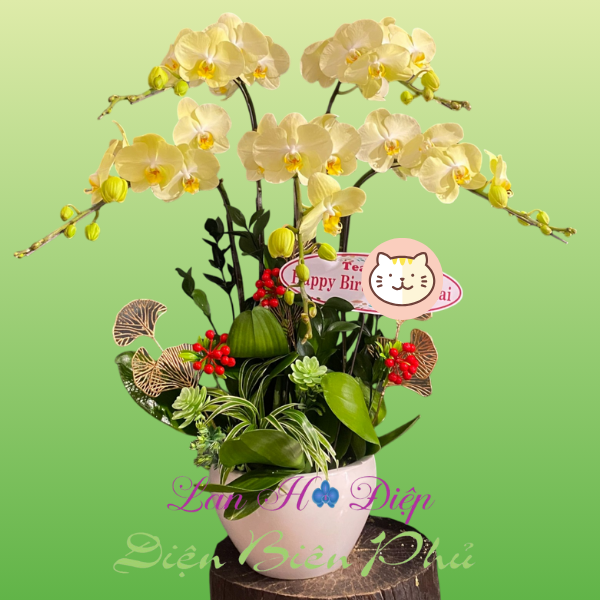 - Chậu Lan Hồ Điệp 5 Cành Xanh Táo được người thợ cắm hoa khéo léo ghép vào chậu sứ trắng tuy nhìn có vẻ đơn giản nhưng khi lại mang đến sự sang trọng cho chậu lan. Một công đoạn không thể thiếu khi tạo ra 1 chậu lan hoàn chỉnh đó là khâu trang trí. Chậu lan có hài hòa, bắt mắt hay không một phần cũng nhờ đến việc trang trí có phù hợp hay không. Và ở chậu lan này, người thợ cắm hoa đã sử dụng những cành lá quạt vàng cùng lá chanh cắm đan xen tạo sự đầy đặn cho chậu lan. Ba cành trái đỏ đan xen với những cành lá quạt đã tô điểm thêm sắc màu cho chậu hoa. Chưa hết, chậu còn được trang trí với sen đá nhỏ nhắn và cây lan chi xanh tươi, tất cả hòa quyện tạo nên một chậu lan hồ điệp hoàn hảo, gửi đến những người yêu lan.