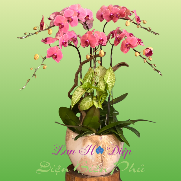 - Chậu lan hồ điệp 5 cành với chiều cao khoảng 80cm, rộng 75cm, một kích cỡ không quá to cũng không quá nhỏ, rất thích hợp để trưng bày ở phòng khách, phòng làm việc, tiền sảnh hay bất kì nơi đâu. 5 cành lan hồ điệp với kích thước mỗi cành dao động khoảng 50cm, mỗi cành có khoảng 5 - 6 bông và 4 - 5 nụ hoa. Các cánh hoa có màu hồng đào mang nét đẹp yêu kiều, tao nhã. Nổi bật trên nền hồng hạnh phúc và những nụ hoa màu vàng mang ý nghĩa của sự giàu sang, thịnh vượng và sung túc. Kết hợp cả hoa và nụ lên một cành lan đã thể hiện trọn vẹn những mong muốn mà bạn muốn gửi đến người nhận.