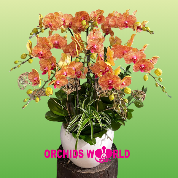 Chậu lan hồ điệp 8 cành cam sọc là sự kết hợp hoàn hảo giữa sắc hoa tươi sáng, vẻ đẹp rực rỡ mà không kém phần thanh tao của những cành lan cùng lối trang trí mang hơi thở của thiên nhiên. Những cánh hoa lan với màu cam rực rỡ có pha lẫn chút ánh vàng, nổi bật trên từng cánh hoa là những đường sọc mềm mại, tạo vẻ đẹp tinh tế và ấn tượng, làm sáng bừng không gian trưng bày. Để làm nên vẻ đẹp của chậu lan thì việc lựa chọn những cành lan đẹp là điều không thể thiếu, ngoài ra người thợ cắm lan cũng phải có tay nghề chuyên nghiệp, mắt thẩm mĩ cao để có thể làm nên chậu lan hoàn chỉnh. Và Orchids World chúng tôi hội tụ đầy đủ tất cả các yếu tố trên. Những cành lan đã được người thợ ghép lan ghép vào chậu sứ trắng sang trọng, tôn lên vẻ đẹp của lan. Với lối trang trí tinh tế, cây cỏ lan chi xanh mướt được gắn chính diện, những cành lá quạt vàng và lá chanh được cắm đan xen ở phía sau tạo nên sự đầy đặn và bắt mắt cho chậu lan.