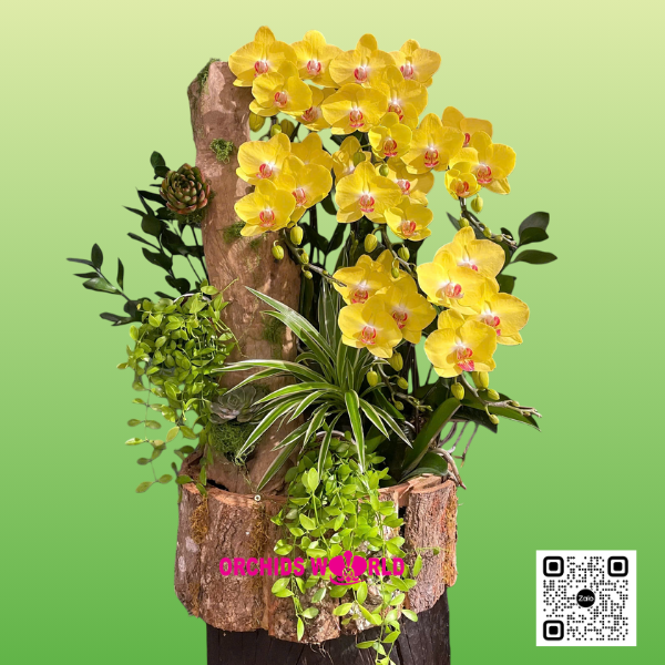 Những cành lan vàng được ghép vào chậu hộp gỗ mộc mạc, chậu Lan Hồ Điệp Vàng mang đến sự kết hợp hài hòa giữa vẻ đẹp sang trọng của hoa lan và nét tự nhiên của gỗ. Những cành lan vàng óng ánh, nở rộ với sắc hoa tươi sáng như ánh mặt trời, vừa rực rỡ vừa thanh thoát, tượng trưng cho may mắn, thịnh vượng và khởi đầu mới tràn đầy năng lượng.