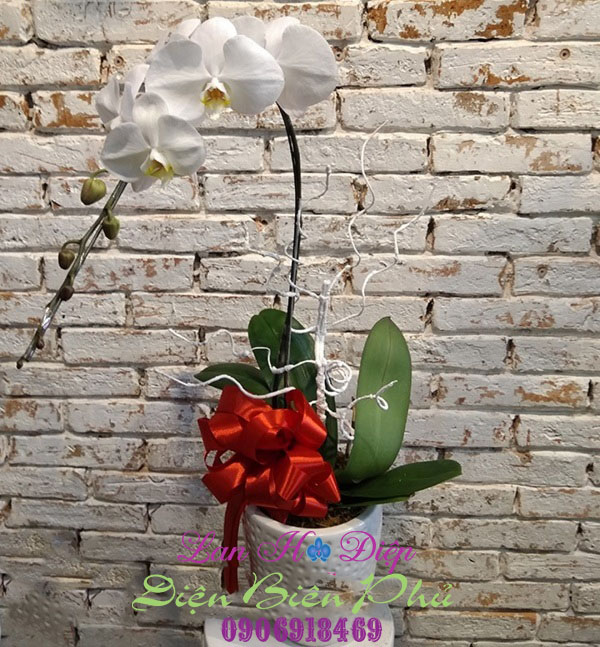 - Chậu Lan Hồ Điệp 1 Cành Trắng là một sản phẩm có bố cục nhẹ nhàng và đơn giản. Chậu sứ màu trắng thon kết hợp những họa tiết hoa văn tròn ẩn không những không làm mất đi vẻ sang trọng của dòng lan trắng mà còn tôn lên vẻ đẹp quý phái, thanh cao của loài hoa này. (Tuy nhiên, bạn có thể chọn mẫu chậu sứ trơn hay sọc, trắng hay màu tùy theo ý bạn). Trang trí bằng nơ sự kiện màu đỏ tươi phá vỡ tông màu trắng thanh lịch nhưng lại là sư kết hợp khá hài hòa, tạo điểm nhấn bắt mắt cho cách trang trí này góp phần thu hút ánh nhìn. Cây tuyết màu trắng được uốn lượn thành những đường cong tinh tế đang xen vào cành lan trắng. Tất cả những điều này tạo nên một sản phẩm hài hòa.