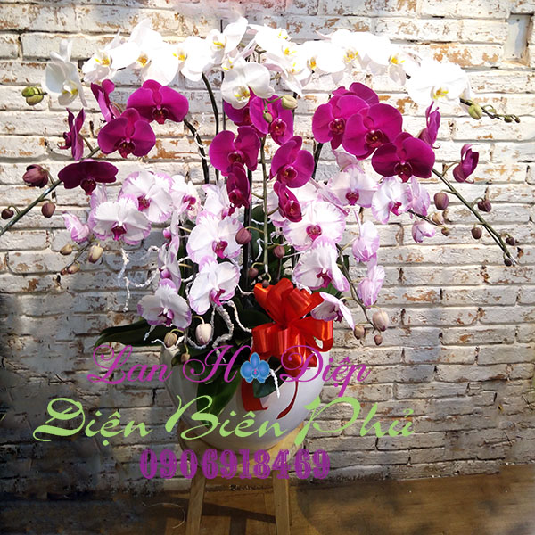 - Chậu Lan Hồ Điệp 10 cành Hồng Chớp Tím Trắng được trang trí một cách đơn thuần chiếc nơ sự kiện đỏ kết hợp với các cây tuyết trắng khiến chậu hoa trở nên sinh động, lung linh, thu hút mọi ánh nhìn của người thưởng hoa. Những cành Lan Hồ Điệp được kết hợp với chậu sứ kèm theo thông điệp yêu thương gởi đến những người thân yêu mang thông điệp ý nghĩa chúc mừng thịnh vượng đến doanh nghiệp bạn bè trong ngày khai trương chông ty, nhà hàng...