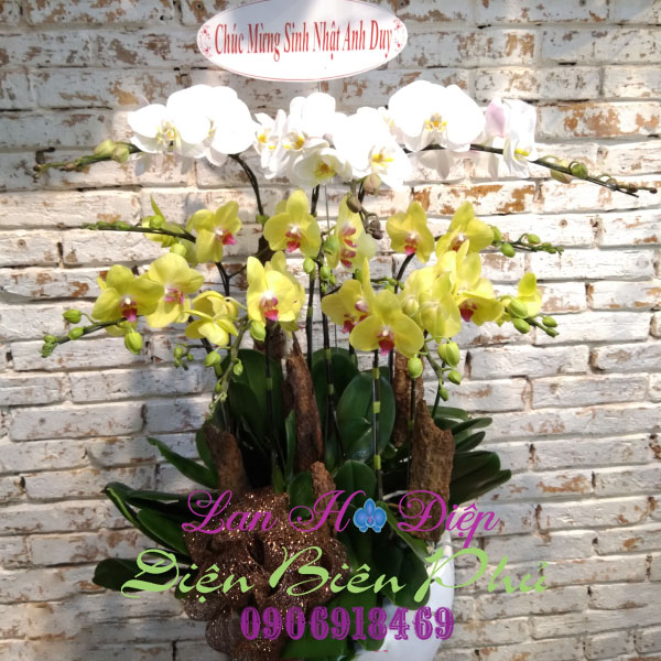 - Chậu Lan Hồ Điệp 10 Cành Vàng Trắng gồm 10 cành lan rực rỡ hòa quyện 2 màu: Vàng và trắng mang đến một sự mới mẻ, sức sống dồi dào, tinh thần năng động và giàu năng lượng. Các cành lan được lựa chọn kĩ càng với độ hoa nở đều từ 6-8 bông/ cành (chưa tính nụ, tùy mùa mà hoa có độ nở nhiều hay ít), được ghép kì công và khéo léo vào nhau tạo thành ba tầng lan rực rỡ trải dài với 2 sắc màu tươi sáng: Tầng một gồm 4 cành vàng, tầng hai và ba lần lượt là 3 cành vàng và 3 cành trắng hòa quyện vào nhau trong chậu lan đem đến sự may mắn, an khang thịnh vượng và phát tài phát lộc cho một khởi đầu đầy suôn sẻ.