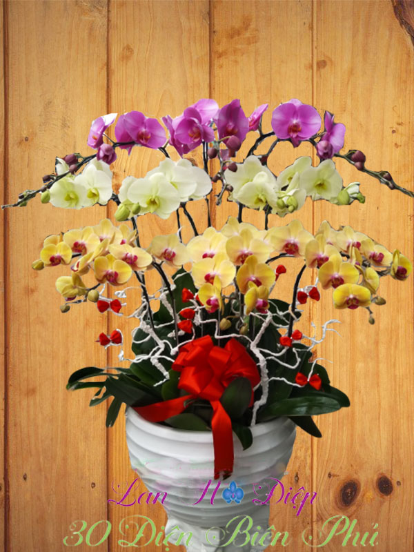 - Chậu Lan Hồ Điệp 12 Cành Vàng Xanh Hồng với pong cách trang trí khá là cầu kỳ, tạo điểm nhấn cho cả chậu lan bởi những cành tuyết trắng kết hợp những chiếc nơ nho nhỏ màu đỏ xinh xinh cùng chiếc nơ sự kiện màu đỏ tươi như mang đến cả một khung trời rực rỡ khiến cho chậu lan thêm sinh động hơn.