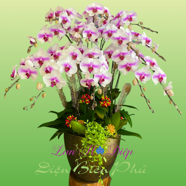 - Mười hai cành lan được ghép vào chậu đồng thể hiện sự đăng cấp và sang trọng của chậu lan. Với lối trang trí tinh xảo, những cành trái đỏ rực rỡ, 2 cành sen đá nhỏ nhắn và 1 chậu hạt dưa cắm rũ tạo điểm nhấn cho chậu lan. Ngoài ra còn có những cành đuôi công vàng trang trí để chậu thêm đầy đặn và nổi bật. Khác với những cành lan thuần 1 màu như trắng, tím, vàng, thì những cành lan này với màu trắng phớt 2 tím, 2 đường tím 2 bên cánh hoa đã tạo nên sự mới lạ cho chậu hoa. Nếu như màu trắng tinh khôi, thuần khiết, màu tím lại lãng mạn, mộng mơ thì với cành lan mang 2 sắc màu này lại toát lên dáng vẻ thanh tao, nhã nhặn nhưng không kém phần kiêu sa, quyến rũ.