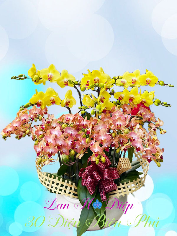 - Chậu Lan Hồ Điệp 12 Cành Vàng Cam Mini gồm 12 cành lan hồ điệp với hai sắc màu cam và vàng được ghép khéo léo tạo hình bắt mắt trong chậu men sứ sang trọng. Mỗi cành lan có độ hoa nở rộ từ 8-15 bông/cành, xum xuê tỏa đều một hướng. Tầng trên cùng là gồm 6 cành lan vàng rực rỡ kết hợp với tầng dưới gồm 6 cành lan cam tươi tắn với kích thước nhỏ nhắn hơn trông thật rực rỡ làm sao.       Những cánh lan nhỏ nhắn, xếp cân đối với nhau tựa như những con bướm đong đưa trong nắng chào đón một khởi đầu, một cuộc sống mới. Sắc vàng thể hiện một niềm tin, hy vọng, đem lại may mắn tài lộc trong cuộc sống, sắc cam là biểu tượng của sự đam mê, nhiệt huyết cháy bỏng. Sự kết hợp giữa hai sắc màu khiến chúng trở nên độc đáo, thu hút mọi ánh nhìn của người thưởng hoa. Chính vì vậy mà chậu lan được rất nhiều người săn đón với mong muốn mang tài lộc vào nhà, hay để dành tặng cho những người thân yêu của mình với mong muốn giúp gia chủ may mắn, phát đạt.