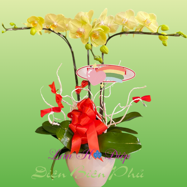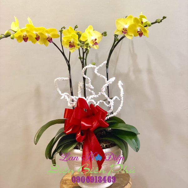 - Chậu Lan Hồ Điệp 3 Cành Vàng Bơ được trang trí một cách mộc mạc, bình dị mà không kém phần sang trọng với chiếc nơ sự kiện màu đỏ tươi tô thêm điểm nổi bật cho hoa, cùng với những cành tuyết trắng có gắn nơ đỏ nhỏ khiến chậu hoa thêm điểm nhấn.
