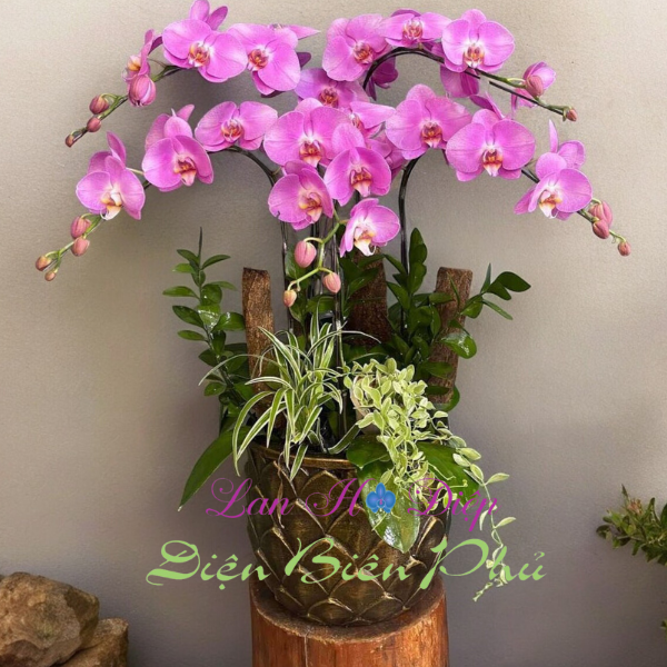 Chậu lan hồ điệp 5 cành hồng với 5 cành lan dịu dàng, hoa to được ghép vào chậu đồng sang trọng, mang nét đẹp cổ điển. Các cành lan được ghép thành 2 tầng, tầng dưới là 3 cành lan và tầng trên là 2 cành lan đều hướng về một mặt. Với lối trang trí tinh tế thêm phần cách điệu, những bản gỗ thông mộc mạc và lá chanh được cắm đan xen, một bụi cỏ lan chi xanh tươi cùng chậu hạt dưa cắm rũ đã làm điểm nhấn cho chậu lan.