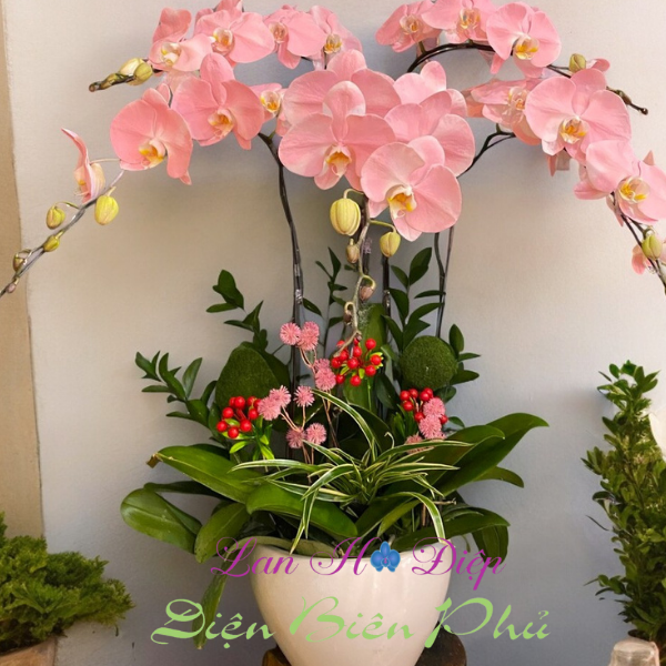 Chậu lan hồ điệp 5 cành hồng đào gồm 5 cành lan màu sắc nhẹ nhàng được ghép vào chậu men sứ trắng tuy đơn giản nhưng lại làm nổi bật lên những cành lan hồng yêu kiều, thướt tha. Năm cành lan được ghép thành 2 tầng và hướng đều về một mặt khoe trọn vẻ đẹp của các cánh hoa la, chúng như những chú bướm bay đong đưa trong nắng mai. Với lối trang trí nhẹ nhàng, những cành trái đỏ, cây tuyết hồng và lá chanh được cắm đan xen cùng 1 bụi cỏ lan chi xanh tươi làm điểm nhấn cho chậu lan.