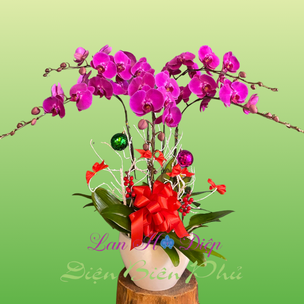 Mang trên mình vẻ đẹp yêu kiều, lãng mạn nhưng không thiếu phần sang trọng và quý phái, bởi như vậy Lan Hồ Điệp mới được mệnh danh là “Nữ hoàng của các loài lan”. 5 cành lan được ghép đối xứng vào chậu men sứ trắng, được chia thành 2 tầng với tầng trên 2 cành và tầng dưới 3 cành tạo sự hài hoà cân đối cho chậu. Dưới bàn tay tỉ mỉ, khéo léo của những người thợ cắm hoa đã điểm tô 2 chùm trái đỏ rực rỡ, 3 cây tuyết trắng có đính những chiếc nơ đỏ nhỏ xinh xắn, 2 trái châu xanh, tím cùng với chiếc nơ lớn màu đỏ tạo điểm nhấn nổi bật cho chậu.