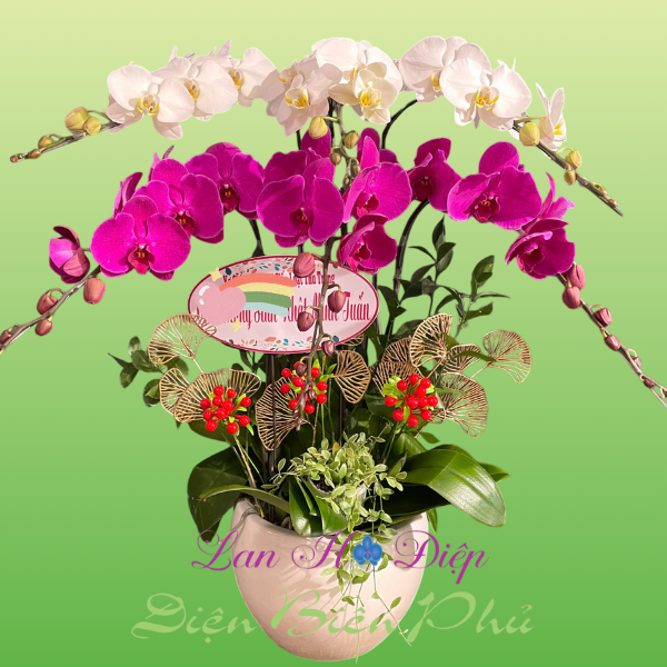 - Chậu Lan Hồ Điệp 6 Cành Tím Trắng gồm 6 cành lan hồ điệp trắng tím có kích thước tầm trung dài khoảng 50-70cm được người thợ cắm hoa ghép khéo léo thành 2 tầng vào chậu men sứ sang trọng với tầng một là 3 cành tím và tầng hai là 3 cành trắng có xu hướng tỏa ra xung quanh. Các cành lan được ghép tỉ mỉ vào nhau rực rỡ trải dài với 2 sắc màu tương phản tím, trắng hòa quyện mà hỗ trợ với nhau thể hiện cho một tình yêu ngây thơ, trong sáng nhưng không kém phần ngọt ngào và lãng mạn.