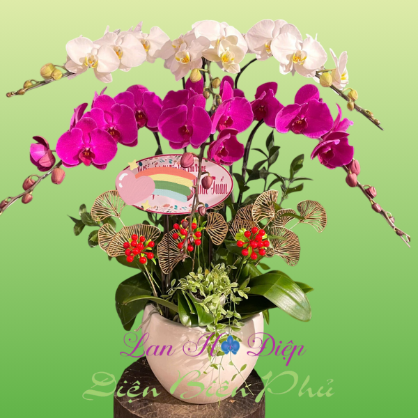 -Chậu Lan Hồ Điệp 6 Cành Trắng Tím gồm 6 cành lan với độ hoa nở rộ từ 10-12 bông/cành tính cả hoa và nụ, hoa trắng và tím bông rất lớn có đường kính cánh hoa từ 12-13cm. Màu trắng là màu của sự tinh khiết, trong trẻo, sang trọng, tượng trưng cho một tình yêu thuần khiết, trong sáng và ngây thơ. Kết hợp hòa quyện hai màu vào một chậu lan cực kỳ độc đáo tượng trưng cho một tình yêu ngây thơ, trong sáng nhưng không kém phần thơ mộng và lãng mạn. Những cánh lan tròn trịa, tươi tắn với màu sắc lộng lẫy, thu hút mọi ánh nhìn bởi vẻ đẹp bắt mắt, rực rỡ và độc đáo kết hợp cùng chiếc lưỡi hoa cong cong trông thật duyên dáng làm sao. Bởi vậy, một chậu lan hồ điệp sẽ là một món quà ngọt ngào bày tỏ thành ý không thể tuyệt vời hơn để dành tặng cho người nhận trong những dịp lễ tết, sinh nhật..