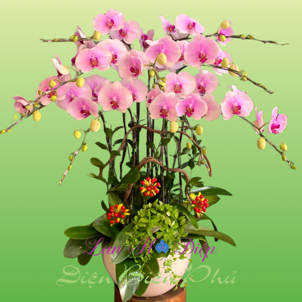 - Chậu Lan Hồ Điệp 9 Cành Hồng Hoa Na với lối trang trí hai đường dây rắn quấn quanh, 3 cành trái đỏ rực rỡ và 1 chậu hạt dưa xanh tươi cắm rũ tạo điểm nhấn cho chậu lan hồ điệp thêm phần hấp dẫn và thu hút mọi ánh nhìn.