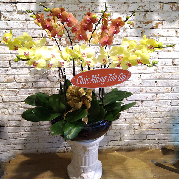 - Chậu Lan Hồ Điệp 9 Cành Vàng Cam được ghép trong chiếc chậu sứ đen bóng, giúp sắc vàng và cam trở nên nổi bật hơn (ngoài ra bạn cũng có thể lựa chọn cho mình những mẫu chậu màu sắc khác nhau như ý) với lối trang trí đơn giản nhưng lại khiến chậu hoa trở nên tinh tế, nổi bật, chỉ với một chiếc nơ vàng kết hợp cùng với các lọn tre nhỏ được uốn tròn gắn vào thân cây trông như những con ốc sên đang đi xây tổ ấm.