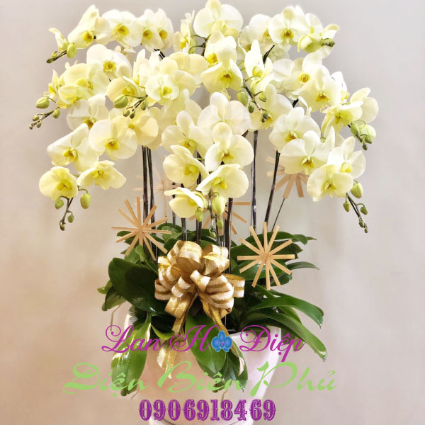 - Chậu Lan Hồ Điệp 9 Cành Xanh Táo với lối trang trí đầy sinh động và lôi cuốn, một chiếc nơ sự kiện vàng kết hợp cùng với những thanh tre được tạo kiểu trông giống những đóa hoa lung linh trước gió.