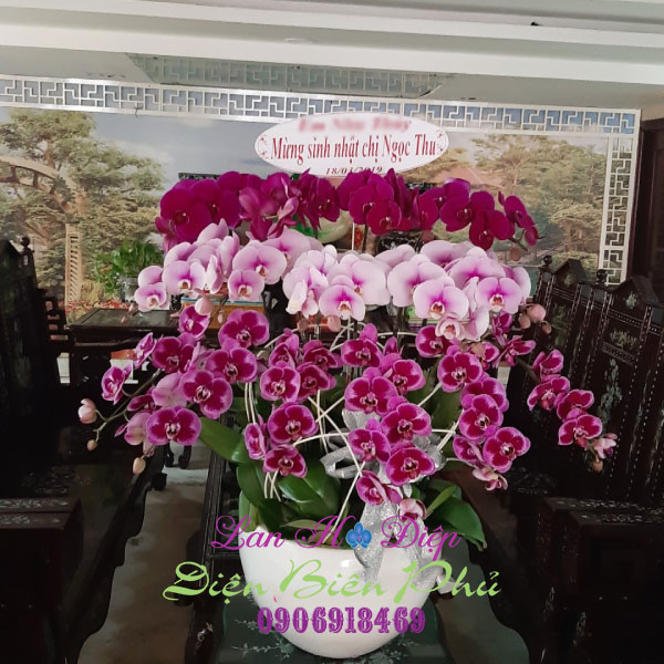 - Chậu Lan Hồ Điệp 15 Cành Tím Hồng với phong cách cắm tỏa tròn gồm 3 tầng lan bởi 15 cành lan hồ điệp tím và hồng đã tạo nên một sản phẩm vô cùng độc đáo. Số lượng các cành lan tăng dần qua mỗi tầng: tầng 1 gồm 4 cành tím, tầng 2 gồm 5 cành hồng đột biến và tầng 3 gồm 6 cành tím đột biến. Mỗi màu sắc của cành lan mang một ý nghĩa tượng trưng riêng mà người tặng muốn gửi gắm. Nhưng chung quy vẫn là thể hiện tình cảm thiêng liêng và tấm lòng chân thành của người gửi muốn truyền đạt vào những cành lan. Các bông lan đang đua nhau khoe sắc, luân phiên nhau nở rộ, hết bông này đến bông kia với những cánh hoa to tròn, đầy đặn và cân đối tựa như những con bướm đong đưa trong nắng mai. Lối trang trí đơn giản, người thợ cắm hoa của công ty chúng tôi đã tinh tế sử dụng những đường cong uốn lượn góp phần làm cho chậu lan thêm duyên dáng và quyến rũ hơn.