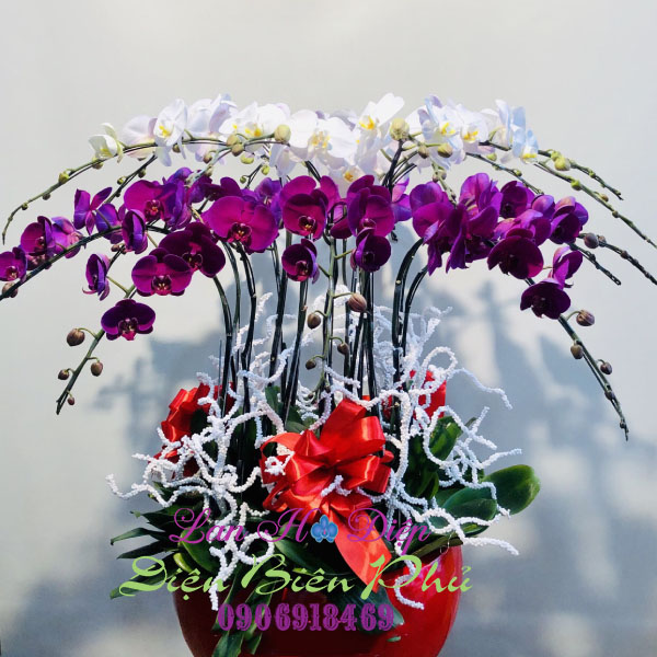 - Chậu Lan Hồ Điệp 15 Cành Tím Trắng 2 Tầng được người thợ cắm hoa của công ty chúng tôi ghép khéo léo với xu hướng tỏa tròn chỉ với 15 cành lan tím và trắng. Mười lăm cành lan được cắm thành 2 tầng: tầng 1 gồm 7 cành lan trắng và tầng 2 gồm 8 cành lan tím với độ dài khoảng từ 60 - 70 cm. Màu tím là màu của sự lãng mạn, đằm thắm và nên thơ kết hợp cùng màu trắng tinh khôi, thuần khiết thể hiện một tình cảm mặn nồng, chân thành và trong sáng của người gửi muốn gửi gắm đến người nhận về một tình yêu thiêng liêng. Những cánh hoa lan cân đối, xếp đối xứng với nhau tựa như những con bướm đong đưa trong nắng mai. Phong cách trang trí có phần bắt mắt khi kết hợp giữa những cành tuyết trắng cùng 3 chiếc nơ sự kiện đỏ tươi cùng chậu men sứ đỏ làm nổi bật chậu lan lên cả một góc trời thu hút mọi ánh nhìn bởi vẻ đẹp độc đáo và rực rỡ.