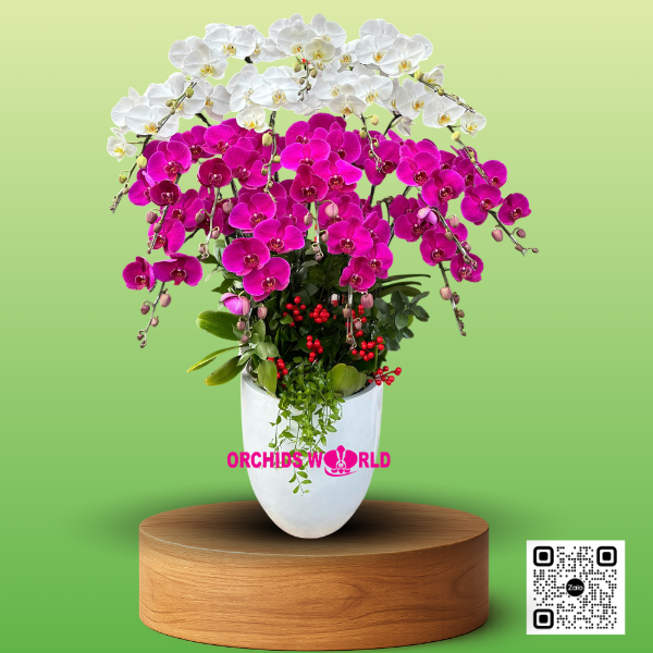 - Chậu Lan Hồ Điệp 15 Cành Tím Trắng là một sự kết hợp hài hòa giữa những cành lan trắng tunh khiết cùng lan tím mộng mơ tạo nên một chậu lan vô cùng độc đáo. Màu trắng là màu của sự tinh khôi, ngây thơ và trong sáng kết hợp với màu tím lãng mạn và đằm thắm khiến bao người đem lòng yêu quý. Đây phải chăng là một biểu tượng về một tình yêu thiêng liêng chăng? Những cánh hoa to tròn, cân đối, xếp đối xứng vào nhau tựa như những con bướm đong đưa trong nắng mai chào đón ngày mới. Người ta thường bảo, số lượng hoa và nụ càng nhiều cả thể hiện sức sống mãnh liệt của gia chủ. Dưới bàn tay tài tình của người cắm hoa đã tạo nên một chậu lan vô cùng bắt mắt và sang trọng, thu hút người xem bởi vẻ đẹp quyến rũ khiến người khác khó lòng mà cưỡng lại được chỉ với vài vật trang trí như đào đông, cây hạt dưa cắm rũ, lá chanh cắm đan xen.