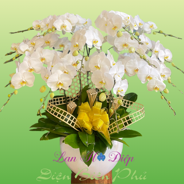 - Chậu Lan Hồ Điệp 15 Cành Trắng gồm 15 cành cao với sắc trắng tinh khiết được ghép thành 3 tầng: ầng 1 gồm 6 cành, tầng 2 là 5 cành, và tầng 3 là 4 cành được ghép một cách độc đáo mới lạ trong chậu sứ cao cấp góp phần tăng lên sự sang trọng của dòng lan. Những cành lan với các bông đã nở rộ, đua nhau khoe sắc tươi thắm khiến người thưởng hoa không khỏi nao lòng nhớ nhung. Sự hòa quyện giữa sắc trắng tinh khôi cùng với màu vàng tượi mới của lưỡi hoa tạo nên sự trẻ trung, năng động và giàu sức sống như mang một luồng sinh khí mới. Chậu lan hồ điệp được trang trí với những miếng lạc tạo hình ôm trọn những cành lan trắng tinh khôi, 1 chiếc nơ vàng rực rỡ tạo điểm nhấn cho chậu hoa.
