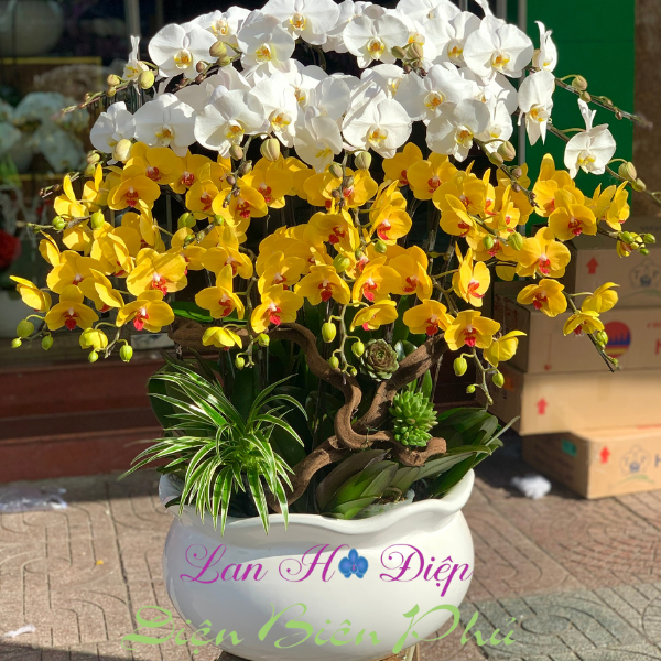 - Chậu Lan Hồ Điệp 20 Cành Trắng Vàng Thần Tài gồm 20 cành lan tươi thắm được ghép khéo léo trong chậu sứ trắng cao cấp thành 4 tầng tỏa tròn: 2 tầng trắng cao rực rỡ ở trên và 2 tầng vàng đậm màu ở dưới có vẻ đẹp hài hòa và lộng lẫy mang đến nhiều tài lộc và an khang phát tài, vạn sự như ý. Màu trắng là màu của sự tao nhã, nhẹ nhàng mà mãnh liệt tượng trưng cho một tình yêu thuần khiết, trong sáng và ngây thơ của tuổi mới lớn. Còn màu vàng rực rỡ đó chính là màu đại diện cho sự sung túc, thịnh vượng và ấm áp thích hợp để chúng ta tin tưởng bắt đầu một sự khởi đầu tốt đẹp. Màu sắc hoa tươi sáng, cánh hoa dày, to tròn, đối xứng với nhau tạo vẻ đẹp hài hòa như những con bướm xinh xắn bay lượn chập chờn. Bởi vậy, chậu lan là món quà thích hợp trong các dịp khai trương hay tết đến xuân về gửi gắm tâm tình của người tặng về một cuộc sống đủ đầy, ấm no...