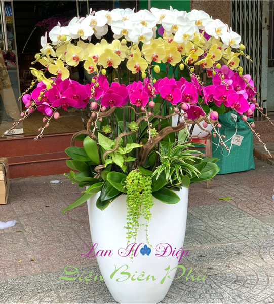 - Chậu Lan Hồ Điệp 20 Cành Trắng Vàng Tím gồm 20 cành lan 3 màu lộng lẫy được ghép khéo léo xen kẽ với nhau thành 3 tầng trong chậu cao cấp đẹp mắt và sang trọng. Với tầng 1 gồm 5 cành trắng, tầng 2 gồm 7 cành vàng và tầng 3 gồm 8 cành trắng. Chậu lan được trang trí rất tinh xảo và công phu với 3 đường dây rắn uốn lượn, bao quanh những cành lan, những cây lá xanh tươi như Trầu Bà, Cỏ Lan Chi, Cây Đô La được cắm xung quanh làm chậu thêm đầy đặn và sinh động. Hơn thế nữa chậu còn có những cây Sen Đá nhỏ đính bên trên những đường dây rắn, tất cả kết hợp tạo nên bức tranh thiên nhiên sống động và hùng vĩ.